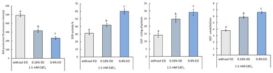 ROS amount and antioxidant/detoxifying enzyme activities (SOD, CAT and GST) in L. riparium gametophytes treated without EOs, with 0.16% and 0.4% of Eos, and after with CdCl2. Bars not accompanied by the same letter were significantly different at p < 0.05. Data are mean of three independent experiments ± SE (n = 5).