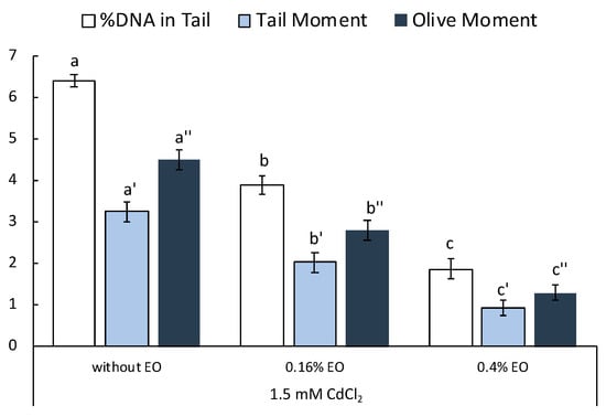 Figure 2 shows DNA damage following exposure to Cd in terms of DNA damage, tail moment and olive moment in both pretreated and untreated samples. Samples of L. riparium exposed to 1.5 mM of CdCl2 show an increase in all three parameters taken into consideration. This should not be surprising given that an excess of ROS can, among other effects, also cause DNA damage, including its breakdown, which, however, can also be due to a direct effect of heavy metals on the nucleotide [41].