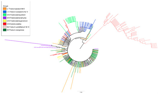 Neighbor-joining tree, based on sequences of 441 accessions of ITS1 ribotypes of the genus ×Trisetokoeleria and its probable progenitors, obtained via NGS. The phylogenetic tree was constructed in MEGA X using the pairwise genetic distance matrix, evolutionary model GTR + G, Maximum Composite Likelihood algorithm.