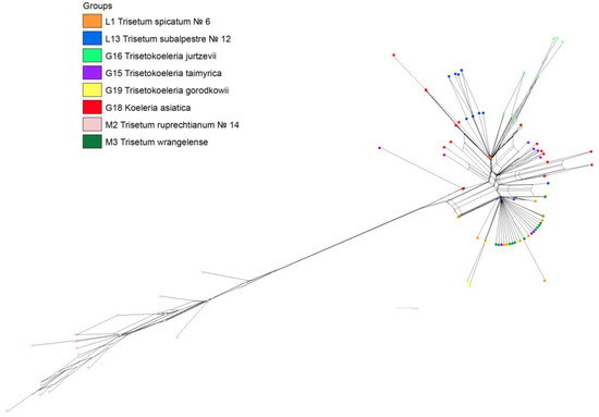 The ribotypes of ×T. taimyrica were intermingled with those of Trisetum wrangelense and T. spicatum (Figure 2). The second major ribotype of Koeleria asiatica and derivatives of this ribotype formed separate branches, as well as those of T. wrangelense. All ribotypes of Trisetum ruprechtianum (a member of T. sibiricum = Sibirotrisetum sibiricum group) belonged to the single group sister of all the other species. The neighbor joining network constructed in SplitsTree 4.18 demonstrated a rougher pattern where the ribotypes of ×Trisetokoeleria jurtzevii, ×T. gorodkowii, Trisetum ruprechtianum, and some ribotypes of Koeleria asiatica, were obviously separated (Figure 3).