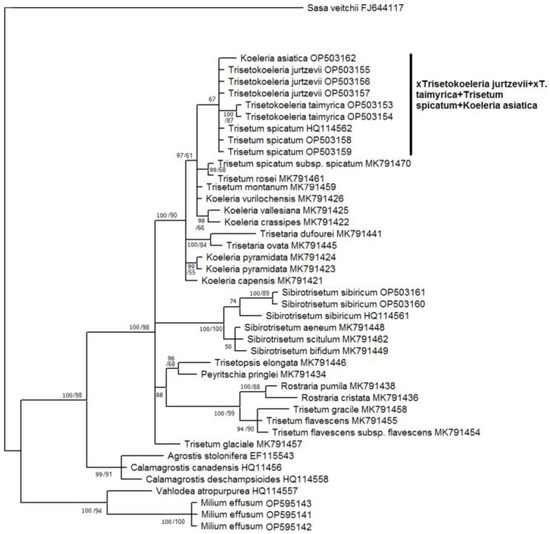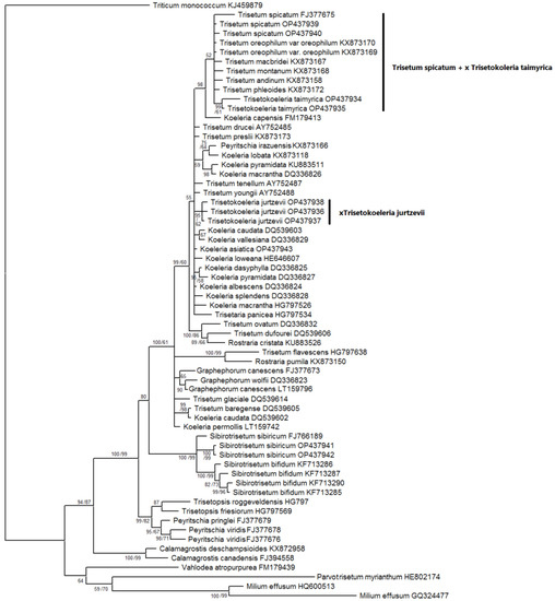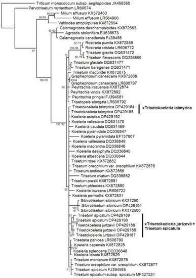 Two samples of ×T. taimyrica formed a subclade (PP = 99, BS = 61) in the clade with the following: Koeleria capensis; Trisetum phleoides Kunth; T. macbridei; T. andinum Benth.; T. montanum; T. oreophilum; and T. spicatum (PP = 98, BS unsupported). The ×Trisetokoeleria jurtzevii samples formed a polytomy with different species of Koeleria, Trisetum (T. tenellum (Petrie) Allan and Zotov ex Laing and Gourlay, T. youngii Hook.f., T. drucei Edgar, and T. preslii (Kunth) É.Desv.), and Trisetaria panicea. All these species formed a highly supported subclade in the Bayesian inference (PP = 99, BS = 60) within the large clade (PP = 100, BS = 61) that also contained the following: Trisetum flavescens + Rostraria pumila; Graphephorum canescens + G. wolfii J.M.Coult.; Trisetum glaciale (Bory) Boiss.; T. baregense Laffitte & Miégev. + Koeleria caudata; and K. permollis Steud. Sibirotrisetum sibiricum (=Trisetum sibiricum) and allied S. bifidum (Thunb.) Barberá group was in a separate clade, which was sister to the big clade comprising all of above-mentioned species.