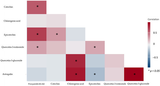 The statistical significance of astragalin in traditional apple varieties; the p-values of the correlations of identified polyphenols. Statistically significant p-values are marked red (p < 0.05).
