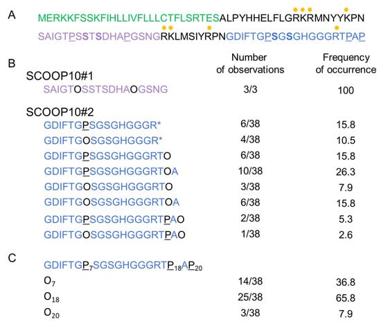 Regarding the post-translational modifications, the SCOOP10 amino acid motifs containing the P hydroxylation sites were of three types: AP, TP and GP. AP and TP are canonical motifs for the hydroxylation of P residues described for the CEP1 peptide [30] and arabinogalactan proteins [31,32]. The GP motif was found to be hydroxylated on the P residue in CLV3, CLE2 [30] and a few other proteins (for a review, see [33]). As previously reported for other cell wall proteins, the pattern of proline hydroxylation is variable [34]. It has been assumed that this variability could contribute to the regulation of biological activity or play a role in recognition of the cleavage site(s) targeted by the endoproteases, as Royek et al. [35] demonstrated with tyrosine sulphation. At this point, our data did not allow us to address the question of the O-glycosylation of the hydroxyproline residues, as reported for a few CLE peptides [36,37,38] and PSY1 [39].