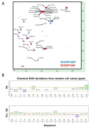 NMR data indicated that the synthetic SCOOP10#2 peptide was largely unstructured in water solution. The NMR assignments of both non-hydroxylated (SCOOP10#2*) and hydroxylated (SCOOP10#2) forms are reported in Supplementary Tables S2 and S3, respectively. The chemical shift of various nuclei—namely, Hα, Cα, Cβ and carbonyl—can be used to ascertain the presence of a secondary structure by observing their deviations from random coil values [14,15,16], which can be predicted by the peptide sequence [17]. The Hα/Cα region of the 1H,13C-HSQC NMR spectrum is shown in Figure 2A, while the chemical shift deviations from random coil values are reported in Figure 2B. The presence of alpha helical structure can be monitored using at least three consecutive negative Hα or Cβ or positive Cα deviations, while the opposite holds for beta strands. The difference between Cα and Cβ deviations is often used as a combined predictor. Overall, the observed deviations were below the threshold value of 0.1 ppm for 1H and 0.7 ppm for 13C [18]. Hydroxylation of P7 and P18 had no major impact on the structure, as indicated by the minimal chemical shift perturbations at most resonances (Figure 2A). Large changes were limited to the atoms of hydroxyprolines (O) and, particularly, to Cγ carbon atoms, as expected.