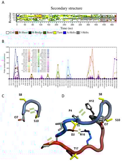 Molecular dynamics simulations also pointed to the absence of a well-defined structure in both SCOOP10#2* and its hydroxylated form, in agreement with the NMR data. Indeed, during MD simulations, an ensemble of different conformations continuously interconverted along the trajectory (Figure 3A). However, these data revealed a certain tendency for the backbone to fold at the level of residues O7-S10, thus exposing S8 and S10 side chains. Interestingly, this region was the one displaying negative Hα and positive Cα-Cβ deviations in the NMR, as expected for the turn of a helix (Figure 3B). Although below the threshold values, these data suggest the presence of a small population of conformers contributing to the average chemical shift value. For this reason, we analysed molecular dynamic trajectories in order to reveal key interatomic interactions that might stabilise such a fold. For SCOOP10#2, the obtained polar contacts map revealed the formation of an H-bond between the amide nitrogen of serine S10 and the carbonyl of hydroxyproline O7 (Figure 3C), a salt bridge between the side chains of aspartic acid D2 and arginine R16 and a salt bridge between the C- and N-termini (Figure 3D). Furthermore, stacking between the aromatic rings of phenylalanine F4 and histidine H12 might also have further stabilised the conformation (Figure 3D).