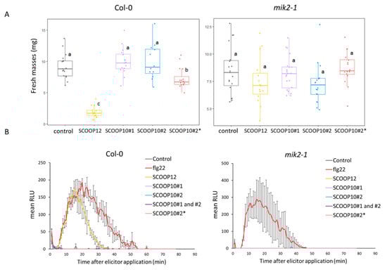Effects of SCOOP10 peptides on seedling growth and on ROS production. (A) Seedling growth inhibition evaluation by measuring fresh mass after 1 µM elicitor or control treatment. (B) H2O2 production after 1 µM elicitor or control treatment measured with a luminol-based assay using leaf discs from four-week-old plants of the indicated genotypes. Data represented are means of three independent replicates in relative luminescence units (RLUs) (n = 3, ±SEM). For (A,B), SCOOP10#1 and SCOOP10#2 correspond to the proline hydroxylated peptides, and prolines are not hydroxylated for the SCOOP10#2*peptide. ANOVA and Tukey test results allow us to define significantly different groups, labelled from a to c, at the p < 0.05 level.