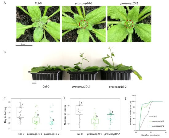 proscoop10 early-flowering phenotype. (A) Bolted inflorescence of the proscoop10 mutant lines, 23nd day after germination. Red circles highlight the bolted inflorescences of the proscoop10 mutant lines compared to Col-0 on the same day. Scale bar = 1 cm. (B) Delay in stem development between mutants and WT due to the early flowering of the proscoop10 lines, 27th day after germination. Scale bar = 1 cm. (C) Average day to bolting for each genotype (n > 40). (D) Average number of rosette leaves at the flowering time for each genotype (n > 25). For (C,D), ANOVA and Tukey tests made it possible to significantly define two different groups labelled a and b. (E) Kinetics represent the numbers of bolted inflorescences in %, starting from day 20 to day 30 after germination (n = 25).