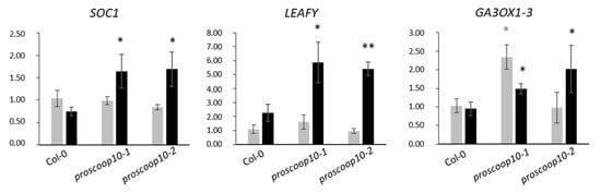 Impact of PROSCOOP10 mutation on transcription of genes involved in floral regulation. Relative expression of SOC1, LEAFY and GA3OX-1 genes was measured by RT-qPCR after 7 days (in grey) and 11 days (in black) in the two proscoop10 mutant lines compared to Col-0 at 7 days. Values represent mean ratios ± SEM of three independent biological replicates. Asterisks denote statistical differences in gene expression levels between prosccoop10 mutants and Col-0: * p < 0.05, ** p < 0.01 (ratio-paired t-test).