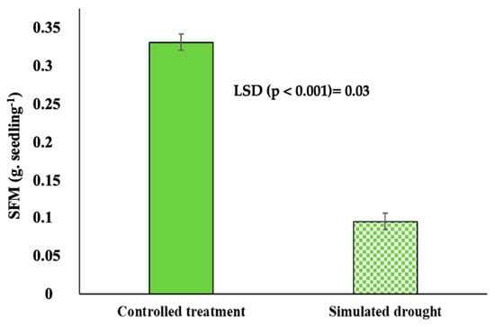 Seedling fresh mass (SFM) of seeds subjected to simulated drought conditions using 5% PEG compared to a control treatment using distilled water.