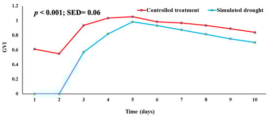 Germination velocity index (GVI) in each day subjected to simulated drought conditions using 5% PEG compared to a control treatment using distilled water.