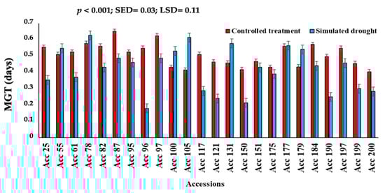 In terms of germination velocity index (GVI), genotypes were significantly different (p < 0.001) with respect to the number of days from the beginning of the experiment (Day 0) (Figure 2). Under the controlled treatment, GVI ranged from 0.693 to 1.327, whereas simulated drought GVI ranged from 0.245 to 1.019. In most genotypes, the germination velocity index was reduced under drought conditions, except for Acc 55, Acc 131, Acc 100, and Acc 179. These genotypes can be considered drought-tolerant. Mean germination time (MGT) also differed significantly (p < 0.001) among the genotypes (Figure 3). A range of 0.40 to 0.65 was observed for mean germination time under controlled treatment conditions and from 0.21 to 0.63 under simulated drought conditions.