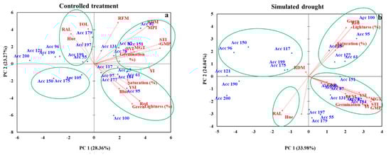 Under SD conditions, Acc 78, Acc 97, Acc 82, Acc 105, Acc 131, Acc 151, and Acc 194 were grouped based on their high GVI, RFM, YSI, MGT, STI, GMP, and germination%. Acc 25, Acc 61, Acc 95, and Acc 100 were grouped based on high Blue, Saturation%, Lightness, Red, and Greenness. Acc 96, 117, 150, 175, and 199 were not associated with any of the traits evaluated in the second quadrant. By contrast, RAL and Hue were not associated with any of the genotypes in the fourth quadrant.