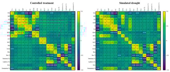 Under simulated drought conditions, PC 1 accounted for 32.39% of the total variation and was positively correlated with MPI, STI, GMP, YI, YSI, RFM, GVI, MGT, Red, Green, Blue, and germination. Red, Green, Blue, Saturation (%), and lightness (%) were positively correlated with PC 2, accounting for 21.91% of the total variation. PC 3 accounted for 17.89% of the total variation and positively correlated with TOL, MPI, STI, GMP, RDM, RFM, GVI, and Red.