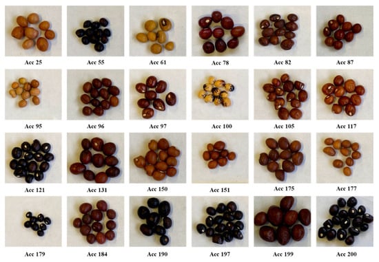 Twenty-four Bambara groundnut genotypes (Figure 6) were obtained from the Agricultural Research Council (ARC) GenBank. Genotypes were obtained from seeds harvested from previous studies. The genotypes were categorized into different seedcoat seed coat colors which are; ochre brown, graphite black, red brown, sepia brown, brown beige, mahogany brown, golden yellow, red brown, clay brown, jet black, fawn brown, signal brown, ochre brown, steel blue, terra brown, and brown olive. In terms of size, Acc 199 had the largest size, followed by Acc 25 and Acc 82. Results of drought indices (Table 6) classify Acc 82 and Acc 96 as highly drought tolerant. The seeds were assessed at the Seed Science Laboratory, School of Agricultural Earth and Environment (SAEES), University of KwaZulu-Natal, Pietermaritzburg, South Africa.