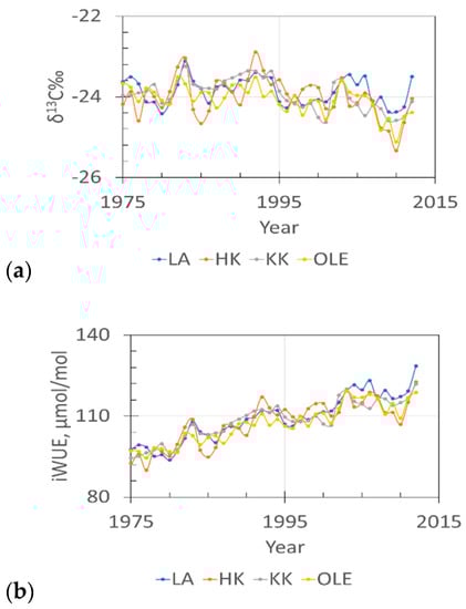 - Ferrio, J.; Voltas, J.; Araus, J. Use of carbon isotope composition in monitoring environmental changes. Manag. Environ. Qual. 2003, 14, 82–98. [Google Scholar] [CrossRef]