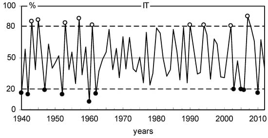 - Schweingruber, F.H.; Eckstein, D.; Serre-Bachet, F.; Bräker, O.U. Identification, presentation and interpretation of event years and pointer years in dendrochronology. Dendrochronologia 2009, 8, 9–38. [Google Scholar]