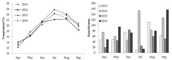 Seasonal patterns of mean air temperature and monthly rainfall in seasons 2013–2016.