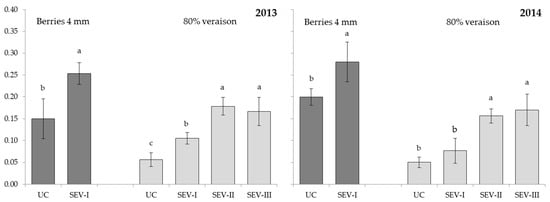 A significant interaction between treatment and year was observed for Brix because treatments SEV-I and SEV-II obtained lower Brix than UC in both years, whereas SEV-III obtained lower Brix than UC only in 2014 (Figure 3). Concerning the sugar content per berry (Figure 4), UC consistently obtained higher values than all the severe trimming treatments throughout the maturation period and in both seasons, whereas SEV-I obtained the lowest values. A greater anthocyanins concentration and per berry content were obtained in season 2013 than in 2014. The concentration of total phenolics was also higher in 2013 than in 2014, whereasa no significant differences were found for the content per berry.