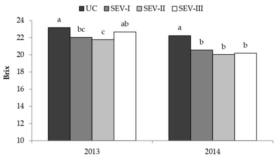 Brix values in berries at harvest date. UC, untreated control; SEV-I, severe shoot trimming when berries were 4 mm in diameter; SEV-II, severe shoot trimming at early veraison; SEV-III, severe shoot trimming at late veraison. Data were analyzed by one-way ANOVA in randomized blocks design. Different letters identify significantly different means.