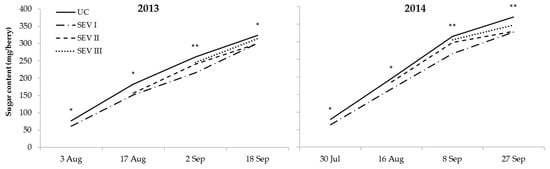 Sugar content in berries (mg/berry) during maturation in seasons 2013 and 2014. UC, untreated control; SEV-I, severe shoot trimming when berries were 4 mm in diameter; SEV-II, severe shoot trimming at early veraison; SEV-III, severe shoot trimming at late veraison. Data were analyzed by one-way ANOVA in randomized blocks design (*, p ≤ 0.05; **, p ≤ 0.01).
