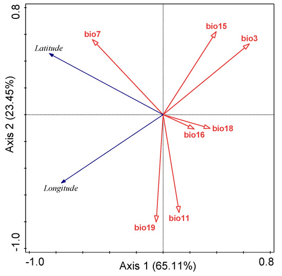 The seven bioclimatic factors and 111 screened distribution coordinates of venerable trees in Sichuan were analyzed by RDA (Figure 2). Bio3, bio7, bio16, and bio18 played a major role in axis 1, with an aggregate contribution of 65.11%. Bio11, bio15 and bio19 played a major role in axis 2, with a contribution of 23.45% (Table 1). The cumulative contribution of the two axes was 88.56%, denoting an excellent explanation of the inter-variable relationships. The longitude was positively correlated with bio19 and bio11, and negatively correlated with bio15 and bio3. The latitude was positively correlated with bio7 and negatively correlated with bio16 and bio18.