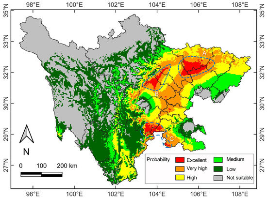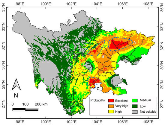 The double CO2 concentration state in the 2100s was applied for the future climate change scenario. Compared with the current climate scenario, the suitability habitat pattern was somewhat modified (Figure 4). Firstly, the excellent habitat area was only marginally increased by 0.15% (12.58 × 104 km2). However, the eastern parts of patches B and C (Figure 3) shrank slightly. In contrast, patch A was somewhat enlarged (Figure 4). Secondly, the very high and high suitability habitats increased to 6.79 × 104 km2 (by 18.22%) and 7.82 × 104 km2 (by 4.95%), respectively (Table S4). Meanwhile, the medium, low and not suitable suitability habitats decreased to 5.18 × 104 km2 (by −1.13%), 11.76 × 104 km2 (by −10.04%) and 15.79 × 104 km2 (by −0.28%), respectively. Therefore, under the future warming scenario, the suitable habitat area for Sichuan’s venerable trees has been predicted to increase.