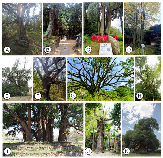 Photographs of main venerable trees and their habitats in Sichuan Province. Photo (A–C) and (E,F) denote Cupressus funebris (Cupressaceae); (D) and (H) Ginkgo biloba (Ginkgoaceae); (G) Machilus nanmu (Lauraceae); (I) Cinnamomum camphora (Lauraceae); (J) Pterocarya stenoptera (Juglandaceae); and (K) Morus australis (Moraceae).