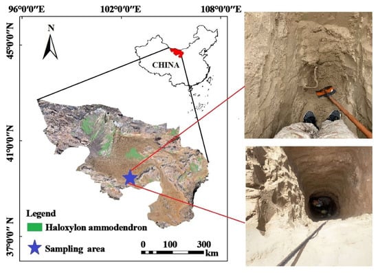 The study area is located in Alxa Legue, Inner Mongolia Autonomous Region (97°10′ E–106°52′ E, 37°21′ N–42°47′ N) (Figure 1); it has a temperate continental climate with average annual sunshine of 3000–3400 h, an average annual temperature of 7–8 °C, average annual precipitation of 76.9 mm mainly concentrated in June–September, annual evaporation of about 4000 mm, and an average annual frost-free period of 155 d. The groundwater level in the study area is 80–120 m, and there are no rivers in the region. The vegetation cover is low, consisting of drought-resistant shrubs and semi-shrubs [22]. Among them, Haloxylon ammodendron plantations are the most important artificial sand-fixing vegetation species in the desert area of Alxa Legue, and since the mid-1970s, large areas of Haloxylon ammodendron plantations have been cultivated, playing a vital role in protecting the local ecological environment. After more than 40 years of cultivation, Haloxylon ammodendron plantations have become the largest desert vegetation type covering the local area; wind and sand invasion have been significantly reduced, and the mobile dunes have been controlled and gradually transformed into fixed dunes.