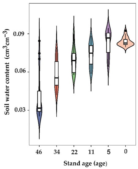 It is reported that afforestation can cause soil moisture to decrease [12,13,14]. Prescribed reduction in stand density has been proposed as a management tool to improve forest sustainability in the face of a warmer, drier future. Results of prior researchshowed that after afforestation, surface soil moisture decreased, and soil moisture relating to different tree species responded differently to afforestation [15,16]. Some studies attempting to evaluate western juniper transpiration and soil moisture relationships at different tree growth stages. They were reported that soil moisture decreases with increasing plantation age, and the soil dries seriously after 12 years [17,18,19]. Thus, a balance between soil water supply and root uptake is critical to the sustainability of ecosystem health [20], especially in dry areas where water is scarce. This means that understanding the hydrological effects of afforestation on soil moisture is important not only for water fluxes in the soil–plant–atmosphere continuum, but also for water cycles and ecohydrological processes in terrestrial ecosystems [11,21].