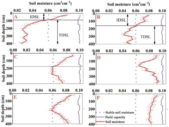 Vertical distribution of soil moisture in Haloxylon ammodendron plantation forested land at different ages: (A) 46, (B) 34, (C) 22, (D) 11, (E) 5 years, and (F) wasteland.