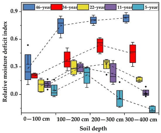 A boxplot of relative moisture deficit index values at depths of 0–4.0 m around Haloxylon ammodendron plantations at different ages.