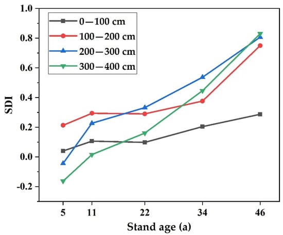 Change in the mean SDI in the soil profile of Haloxylon ammodendron plantations at different ages.