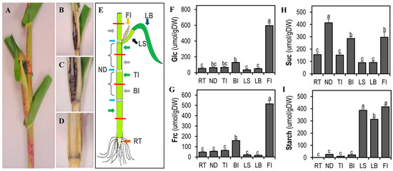 To compare carbohydrate composition at vegetative stages with early reproductive stages, vegetative tissues were collected from the Puma hybrid plants at stage V12, before female inflorescences were visible. Glc levels were similar in the vegetative tissues at the V12 stage (ND 62.9 µmol/g; TI 57.5 µmol/g; RT 53.7 µmol/g; LB 42.4 µmol/g; LS 39.0 µmol/g) and in the reproductive tissues at the R1 stage (ND 63.1 µmol/g; TI 67.0 µmol/g; RT 52.87 µmol/g; LB 50.7 µmol/g; and LS 34.4 µmol/g) (Figure 2F–I and Figure S3). Starch levels were also similar between these two stages in most of the tissues, with the exception of the ND, which had 60.5 µmol/g at the V12 stage and 26.7 µmol/g at the R1 stage (Figure 2F–I and Figure S3). The sucrose level nearly doubled from the V12 stage (ND 199.3 µmol/g; TI 86.1 µmol/g; BI 143.2 µmol/g; RT 78.1 µmol/g; LS 53.4 µmol/g) to the R1 stage (ND 413.9 µmol/g; TI 151.6 µmol/g; BI 286.1 µmol/g; RT 155.8 µmol/g; LS 90.6 µmol/g) (Figure 2F–I and Figure S3). The root tissue had similar levels of Frc and Glc, but starch was almost undetectable at both the V12 stage (3.9 µmol/g) and at the R1 stage (1.23 µmol/g). At the V12 stage, the top internode section had Glc (57.5 µmol/g), Suc (86.1 µmol/g), and starch (6.4 µmol/g) patterns that were similar to those of the root tissue (53.7 µmol/g, 48.9 µmol/g, and 3.9 µmol/g, respectively) (Figure S3). Fructose was higher in the bottom internode, but glucose levels were similar in the different tissues (Figure S3). Both hexoses and metabolite levels can change constantly due to their role as part of other complex metabolites such as sucrose and starch. Starch accumulation in the leaves was also high (Figure 2I and Figure S3D), while hexose and sucrose levels were lower than they were in the other tissues (Figure 2F–H and Figure S3A–C). In summary, iodine staining showed similar levels of starch in the female inflorescence and the stem sections at early developmental stages. At reproductive stage R1, differential starch and hexose/sucrose levels in the female inflorescence and stem suggest that contrasting sucrose–starch metabolism occurs in those tissues.