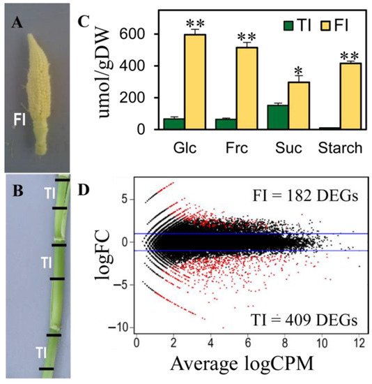Transcriptomic comparison of the female inflorescence and top internode of the maize stem at 60 DAS. (A,B) Tissues used to build the libraries for transcriptomic analysis; (A) FI, female inflorescence and (B) TI, top internode. (C) Carbohydrate level differences between FI and TI; mean ± SE, n = 10, unpaired t-test, df = 10, * p < 0.05, ** p < 0.01. (D) Differentially expressed genes (DEGs) between FI and TI; DEGs visualized as a MA plot (log ratio vs. abundance) where each dot represents a gene, and a red dot represents a significantly DEG where FDR < 0.05 and log2FC (log of fold change) > |2|; log2CPM, log of count per million.