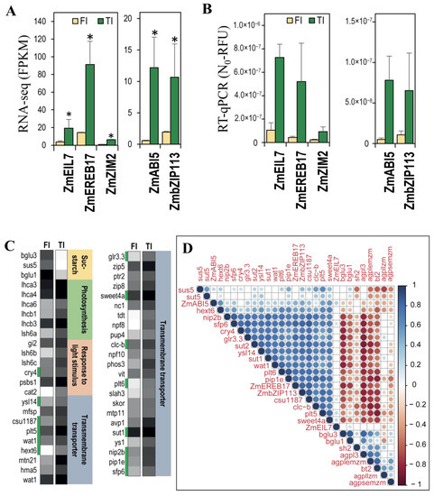 Figure 6D shows a correlation matrix built with the full transcriptome data from the maize B73 genome atlas. Genes represented here include the differentially expressed transcription factors from Figure 6A,B, sucrose–starch enzymes from Figure 5B–D, and differentially expressed genes from Figure 6C. Sus5 (Sucrose synthase 5) and Agpllzm (ADP-glucose pyrophosphorilase large subunit) expression were negatively correlated, as observed in the FI and TI transcriptomes (Figure 5B,D). In contrast, a large cluster with a significant positive correlation includes the Ereb17 and bZip113 transcription factors, three sucrose transporters (Sut1, Sut2 and Sweet4a), and many other classes of transporters (green marks in Figure 6C). This suggests that the bZIP113 and ABI51 transcription factors could be involved in the regulation of transport, including sugar transport, in the top internode of the stem. This cluster was negatively correlated with the AGPase isoforms related to starch synthesis (Agpl3, Agplemzm, Bt2) as well as bGlu1 and bGlu3, which were more expressed in the FI tissue. Overall, sugar transporter genes showed the highest positive correlation with the bZip113 and Ereb17 transcription factors.