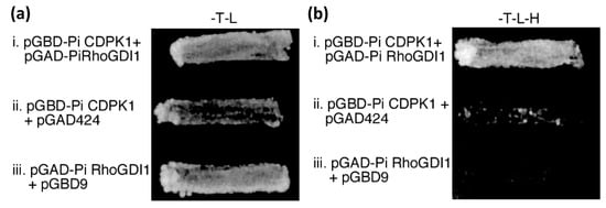 PiRhoGDI1 interacts with PiCDPK1 in vivo. Yeast transformed with bait (pGBD) and prey (pGAD) constructs or empty vectors (as labeled) were grown on (a) media lacking tryptophan and leucine (plasmid selection), and (b) media lacking trytophan, leucine, and histidine, providing selection for both plasmids and interaction of fusion proteins. Only cells transformed with pGBD-PiCDPK1 and pGAD-PiRhoGDI1 grew well on histidine selection, suggesting these clones encode proteins that interact.
