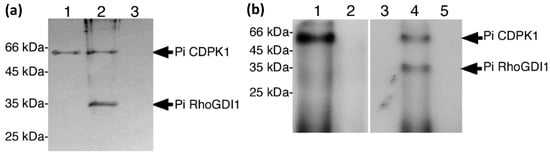 2.2. PiRhoGDI1 Interacts with and Is Phosphorylated by PiCDPK1 In Vitro