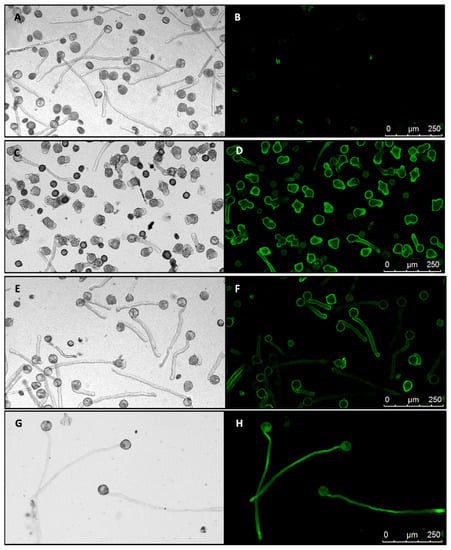 Confocal images were taken with a Leica TCS SP8 confocal laser-scanning microscope (Leica Microsystems, Wetzlar, Germany) at the 514-nm excitation wavelength to image GFP fluorescence. Light micrographs were also taken for each sample and the pollen tubes quantitatively analyzed by measuring tube lengths with the FIJI distribution of ImageJ [].
