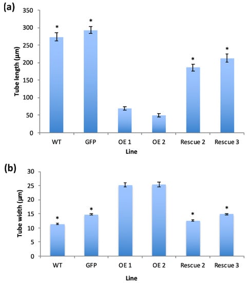 Pollen from the various homozygous lines was cultured in vitro for 4 h and the phenotypes assessed. Pollen germination was not significantly different from wild type for any of the transgenic lines (Figure S3), in contrast there were significant differences in pollen tube phenotypes. Pollen expressing GFP alone grew with normal polarity to an average length of 293 µm, 107% of the average wild-type tube length (273.4 µm), the difference between the two was not statistically significant (Student’s t-test, p > 0.1) (Figure 3G,H). In contrast, consistent with previous transient expression studies, overexpression of PiCDPK1:GFP (OE lines) resulted in the majority of the pollen growing short, often almost spherical, pollen tubes (Figure 3G,H) []. Pollen from two independent lines over-expressing PiCDPK1:GFP (OE1 and OE2) alone grew to an average tube length of 68.6 µm (OE1) and 49.7 µm (OE2), 25% and 18%, respectively, of the average wild-type tube length (273.4 µm), both lines being significantly decreased in length relative to wild-type (Student’s t-test, p < 0.001). In contrast, lines expressing PiCDPK1:GFP and PiRhoGDI1 (Rescue lines) grew to an average length of 185.9 µm (Rescue 2) and 213 µm (Rescue 3), 68% and 78% respectively, of wild-type (Figure 4a). Both rescue lines exhibited significantly increased tube length compared with the overexpression lines (Student’s t-test, p < 0.001, Figure 3E,F and Figure 4a). Consistent with reduced length resulting from loss-of-polarity, tube width was also affected. Pollen expressing PiCDPK1:GFP alone displayed an average tube width of 25.3 µm (OE1) and 25.4 µm (OE2), 222% and 224% of and significantly different from wild type (11.4 µm) (Student’s t-test, p < 0.001) (Figure 4b). In contrast, rescue lines overexpressing both PiCDPK1:GFP and PiRhoGDI1 pollen grew to average widths of 14.9 µm (Rescue 3) and 12.6 µm (Rescue 2) these widths being significantly decreased relative to the OE lines (Student’s t-test, p < 0.001). Average pollen tube widths from rescue lines were more similar to those of the wild-type tubes, being 111% (OE1) and 131% (IE2) of the average wild-type tube width (Figure 3E,F and Figure 4b).