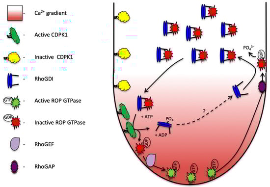 In this pathway, Ca2+ influx at the growing pollen tube tip provides the spatial information that leads to the plasma membrane recruitment, placing it in position for subsequent activation of ROP. This model is consistent with many previously reported observations. First, though the majority of ROP in pollen tubes is cytosolic, the active fraction localizes to the apical region of the plasma membrane, coincident with the peak of the tip focused Ca2+ gradient []. This tip region is the only location in pollen tubes that has cytosolic Ca2+ levels sufficient for PiCDPK1 activation []. As noted above, ROP has been reported to be upstream of cytosolic Ca2+ through a pathway involving RIC3 []. This being the case, Ca2+ and PiCDPK1 act downstream of ROP in addition to regulating its activation and these molecules thus form a positive feedback loop (Figure 6). Such feedback loops are common components of GTPase pathways involved in polarity and exist in pollen tubes [,,,]. Empirical support for involvement of PiCDPK1 in such a feedback loop is provided by its over-expression not only leading to loss of growth polarity but also dramatic elevation of cytosolic Ca2+ within the tube tip []. The model proposed is also consistent with a report that mutant ROP, lacking the ability to interact with RhoGDI, accumulates at the plasma membrane in the pollen tube shank and does not exhibit the tip localization of wild type ROP []. Lastly, more than 25 years ago it was shown that asymmetric release of caged Ca2+ within a pollen tube tip leads to growth re-orientation, focused to the location of Ca2+ release []. The model proposed provides a mechanism to explain how this phenomenon occurs.
