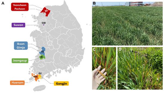 Locations of oats’ sample collection in Korea (A) and the viral symptoms of oat plants (B–D).