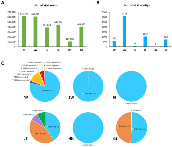 The virus-associated contigs from the dataset were first combined and then classified. We identified three different viruses, BYDV, CYDV, and RBSDV in all libraries (Figure 2C). Of these, BYDV-PAV was the most frequently identified virus based on the number of identified contigs in all libraries. BYDV-PAV (446 contigs) and RBSDV (123 contigs) were identified from YP. BYDV-PAV (3101 contigs) and CYDV-RPS (12 contigs) were identified from SW, whereas BYDV-PAV (59 contigs and seven contigs) was only identified from IG and HN, respectively. BYDV-PAS (453 contigs), BYDV-PAV (415 contigs), CYDV-RPS (91 contigs), and CYDV-RPV (83 contigs) were identified from JE, whereas BYDV-PAV (369 contigs), BYDV-PAS (352 contigs), and CYDV-RPS (2 contigs) were identified from GJ. Interestingly, RBSDV was identified only in YP.