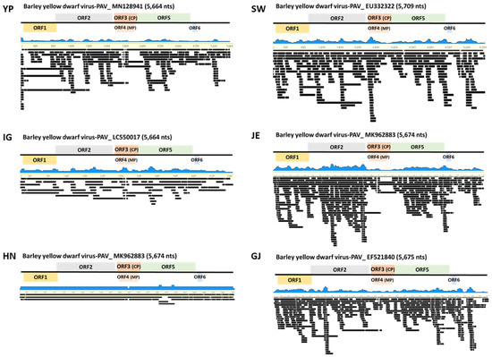 Viral genome assembly of identified BYDV-PAV isolates. Genome organization of assembled BYDV-PAV isolates genome of YP, SW, IG, JE, HN, and GJ. Viral genomes were obtained from assembled virus-associated contigs and their mapping on the reference virus genome.