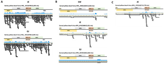 Genome assembly of identified BYDV-PAS isolates, CYDV-RPS, and CYDV-RPV isolates. Genome organization of assembled BYDV-PAS isolates genome from JE and GJ (A), CYDV-RPS isolates genome from SW, JE, and GJ (B), CYDV-RPV isolate genome from JE (C). Viral genomes were obtained from assembled virus-associated contigs and their mapping on the reference virus genome.
