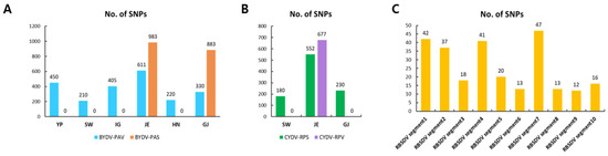 Identification of SNPs for identified viruses in each library. (A) The number of identified SNPs for BYDV-PAV and BYDV-PAS. (B) The number of identified SNPs for CYDV-RPS and CYDV-RPV. (C) The number of identified SNPs for RBSDV segments.