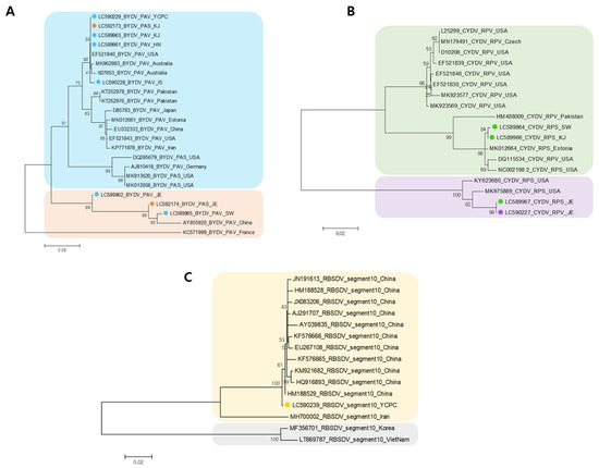 Phylogenetic trees for the identified BYDVs, CYDVs, and RBSDV. For the construction of the phylogenetic tree, coat protein (CP) nucleotide consensus sequences of identified viruses including BYDV (A), CYDV (B), and RBSDV (C), were assembled by RNA-seq. Assembled virus CP nucleotide sequences and other virus isolates CP nucleotide sequences obtained from GenBank were used for construction of phylogenetic trees. Phylogenetic trees were constructed using the MEGA7 program with maximum likelihood method and bootstrap with 1000 replicates. The identified virus isolates from this study were indicated by the different colors.