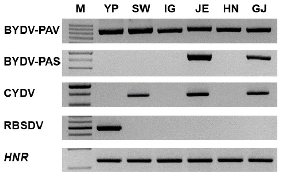 Confirmation of the identified viruses infecting oats by RT-PCR. RT-PCR results with specific primers; BYDV-PAV, BYDV-PAS, CYDV, and RBSDV. The HNR was used as an internal control [39]. Amplified PCR products were visualized by 1.2% agarose gel electrophoresis. The total RNA extracted for RNA-seq were used for RT-PCR.