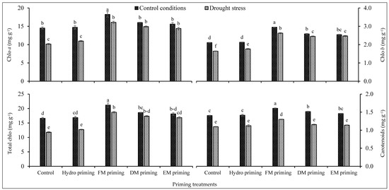 Impact of moringa leaf extracts as priming agents on photosynthetic pigments of rice seedlings cultivated under control and water deficit regimes. Bars sharing the same letter did not differ significantly at p = 0.05.