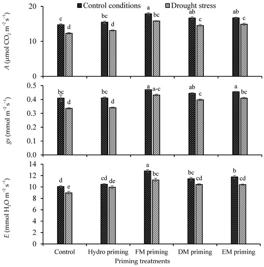 Impact of moringa leaf extracts as priming agents on gas exchange attributes of rice seedlings cultivated under control and water deficit regimes. Bars sharing the same letter did not differ significantly at p = 0.05.