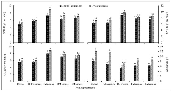 Impact of moringa leaf extracts as priming agents on antioxidant activities of rice seedlings cultivated under control and water deficit regimes. Bars sharing the same letter did not differ significantly at p = 0.05.
